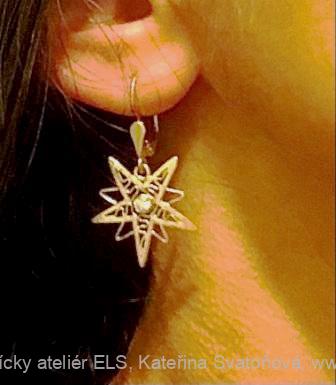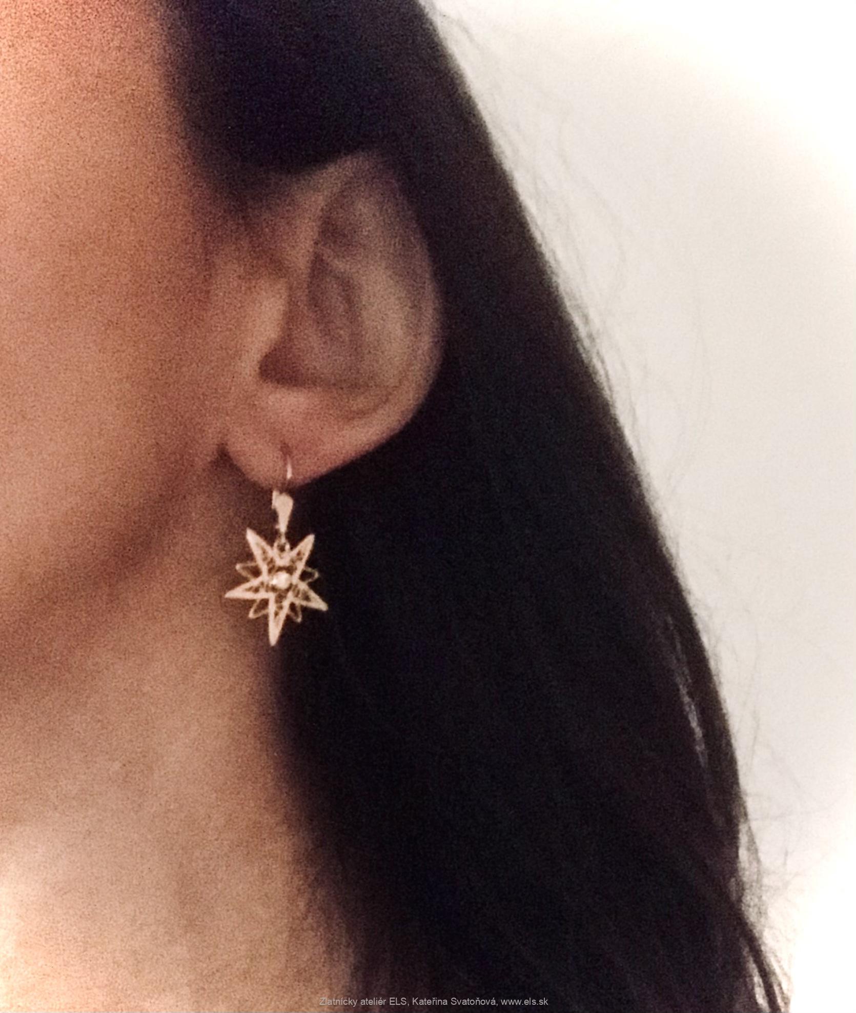 Výrobca zlatnícky ateliér ELS: Dámské náušnice: šťastné hviezdy velkosť 2,20 cm,dlžka náušníc 3,70 cm. Originál. Autorský vzor.Filigránová technika.